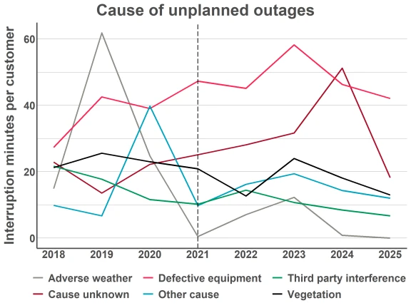 The two major contributors of unplanned SAIDI during the CPP period were interruptions caused by defective equipment and those with unknown causes. In the year ending March 2024, there was a significant rise in the unplanned SAIDI associated with “cause unknown” because of interruptions to all customers connected to the Clyde Grid Exit Point.