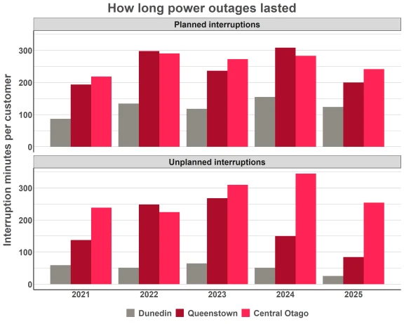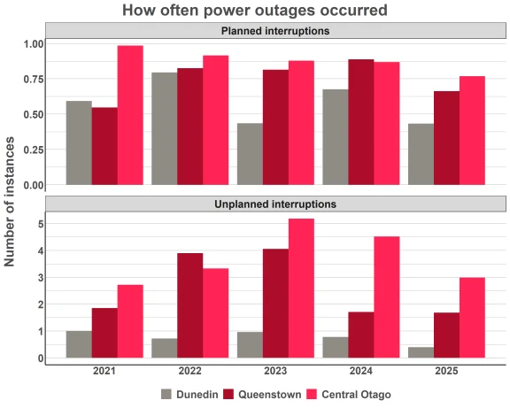 The frequency of power outages (SAIFI) has been increasing overall in the Dunedin and Queenstown regions but decreased over time in the Central Otago region.